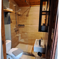 Kleine badkamer met toilet en douche.